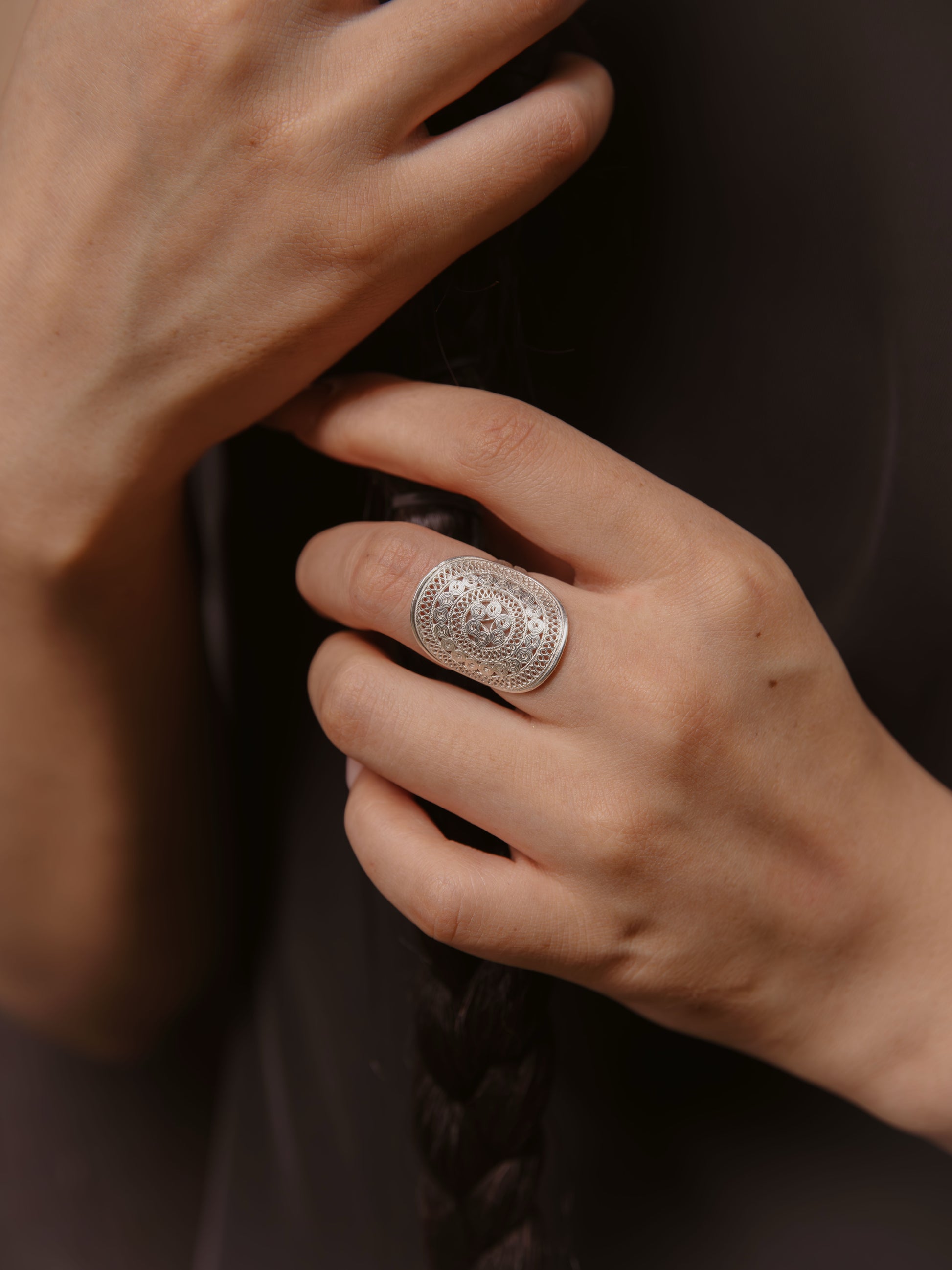 This ring is inspired by the traditional drums of the Miao ethnic group. The design transforms the shape and rhythm of the Miao drum into a sculpted silver piece that rests elegantly on the hand.